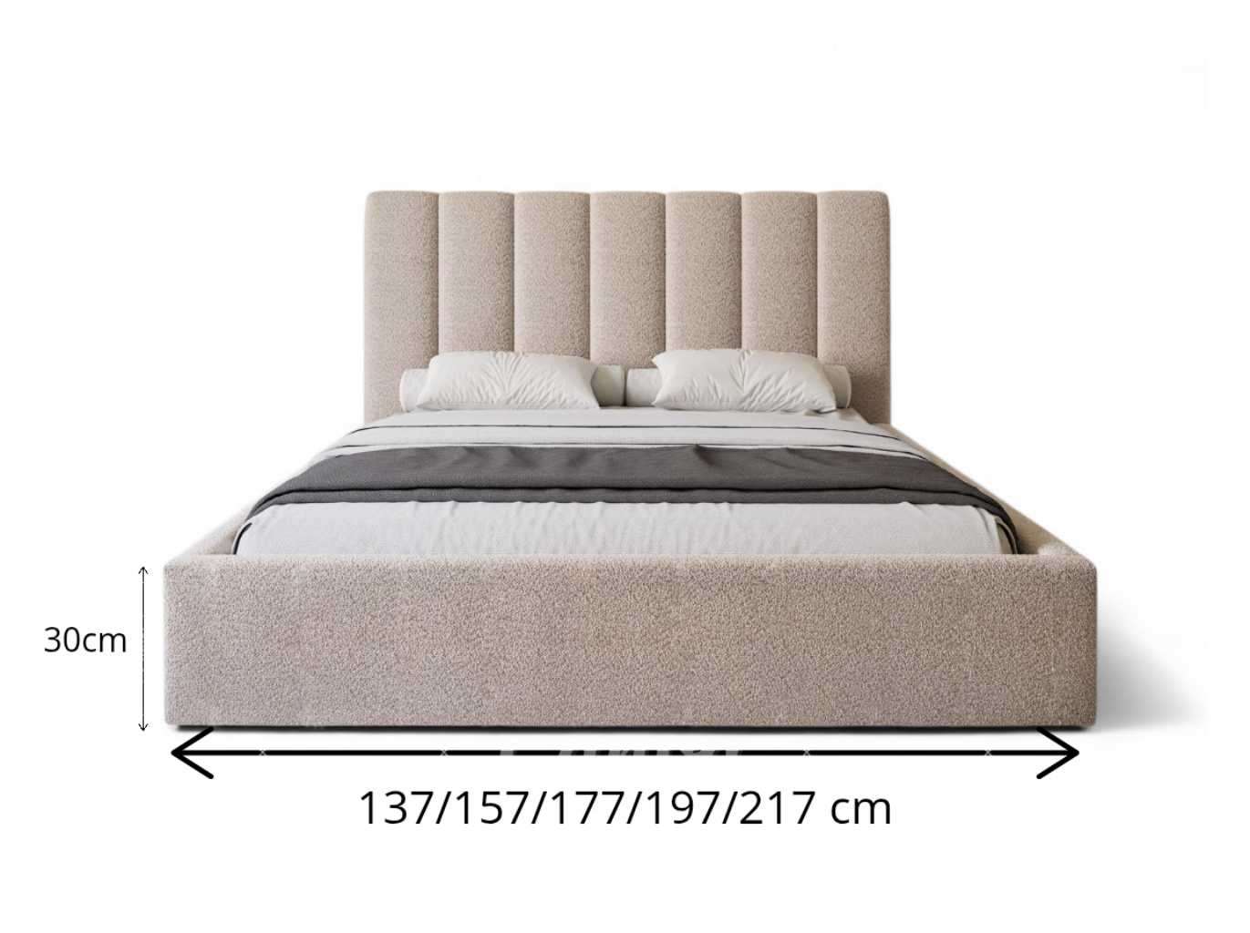 Vorderseite eine Höhe von 30 cm aufweist. Die Gesamtbreite des Bettes variiert je nach