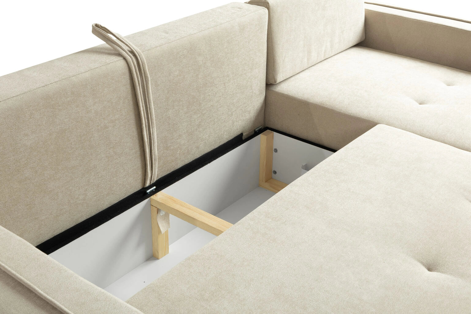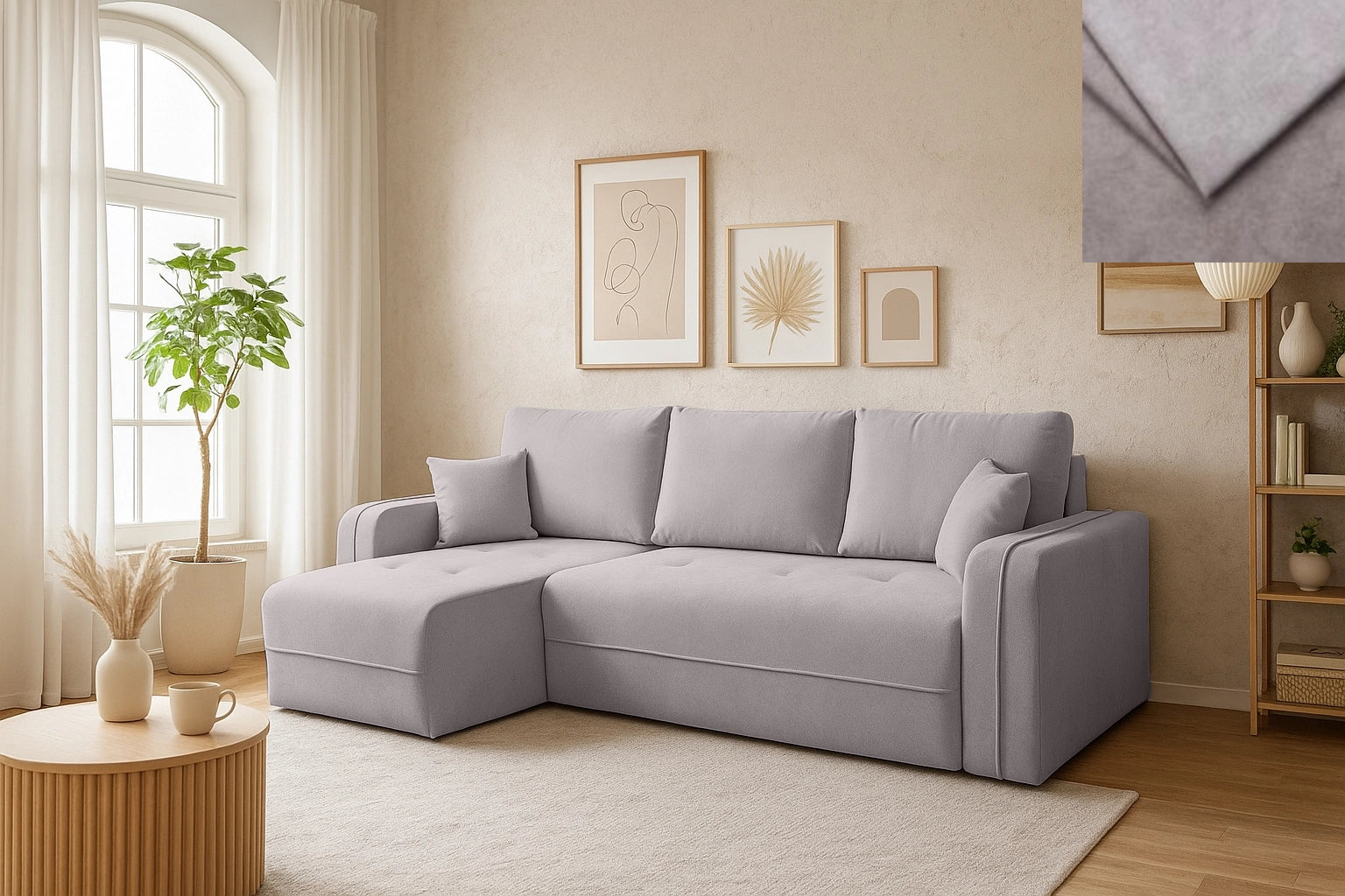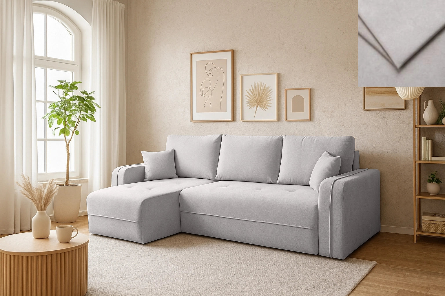 Das Ecksofa ist mit dem Stoff WHISPER bezogen, der durch seine zarte Textur und seine außergewöhnliche Weichheit besticht. Das Material ist nicht nur angenehm auf der Haut, sondern auch abriebfest und pflegeleicht.