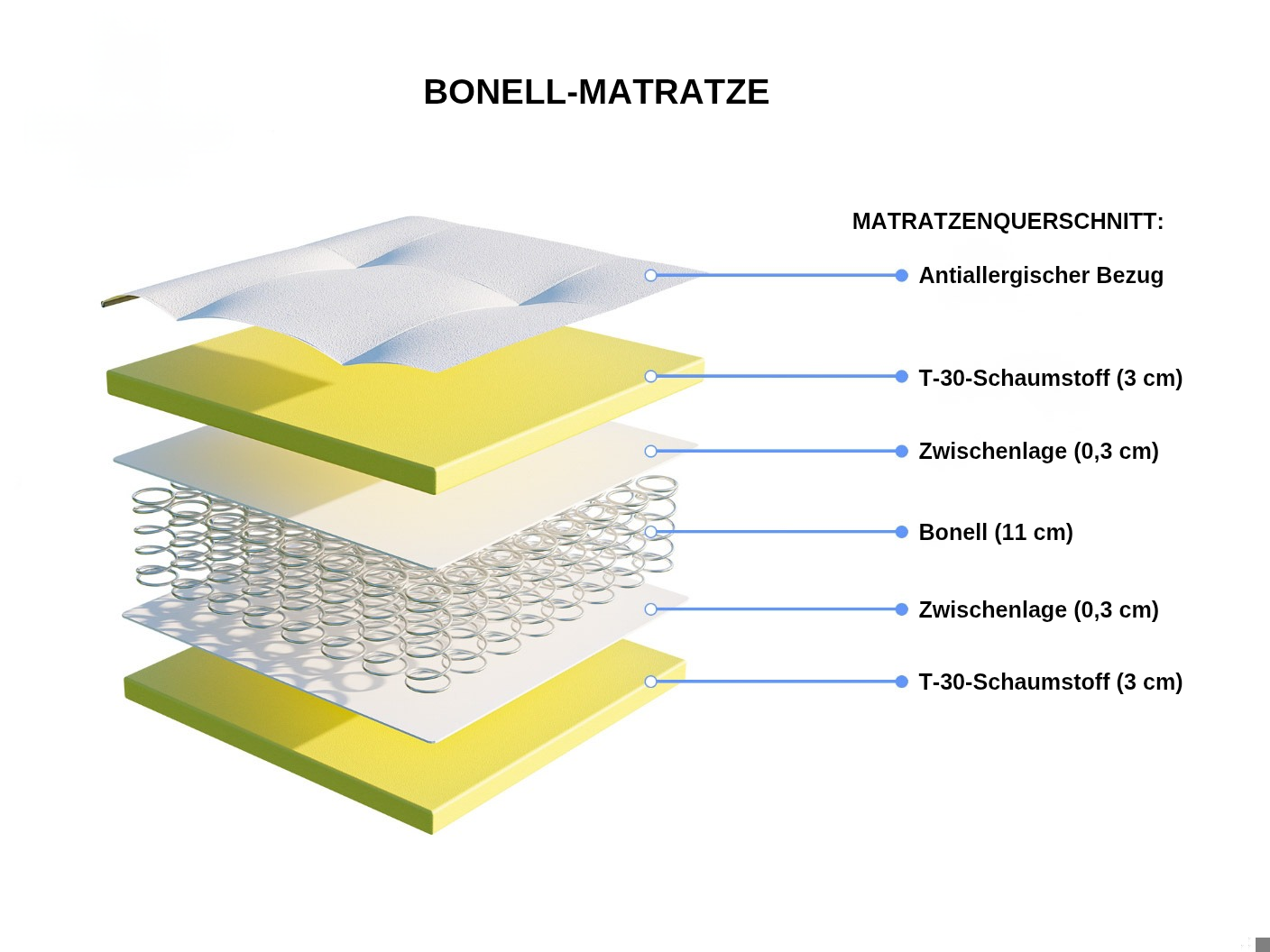 Der 11 cm Bonellfederkern sorgt für gleichmäßige Unterstützung, gute Belüftung und hohe Strapazierfähigkeit. Beidseitige T30 Schaumstoffschichten (3 cm) erhöhen den Liegekomfort, verbessern die Druckentlastung und verlängern die Lebensdauer der Matratze.