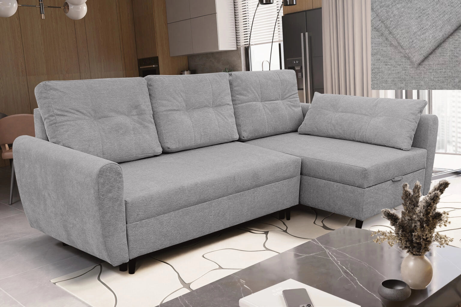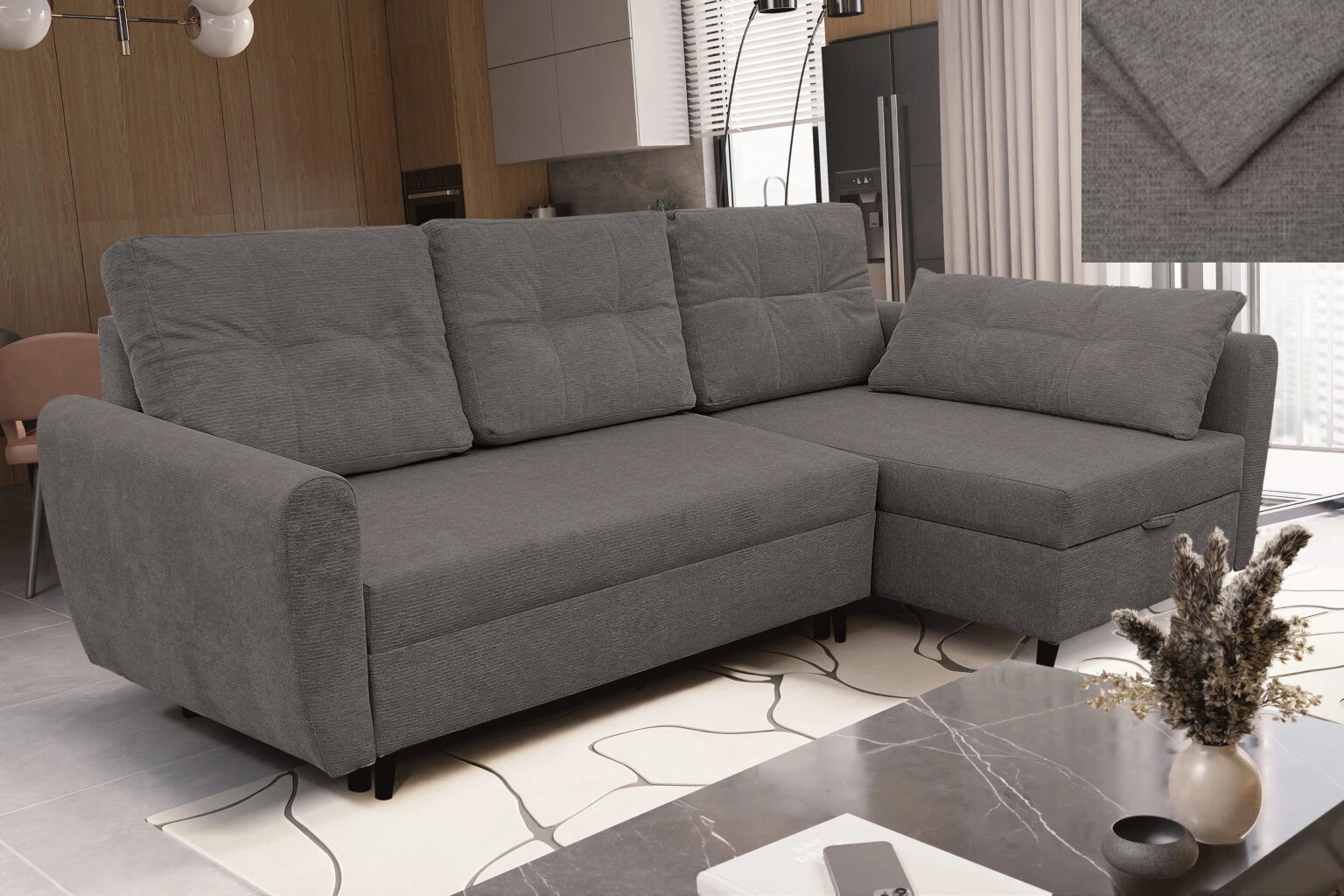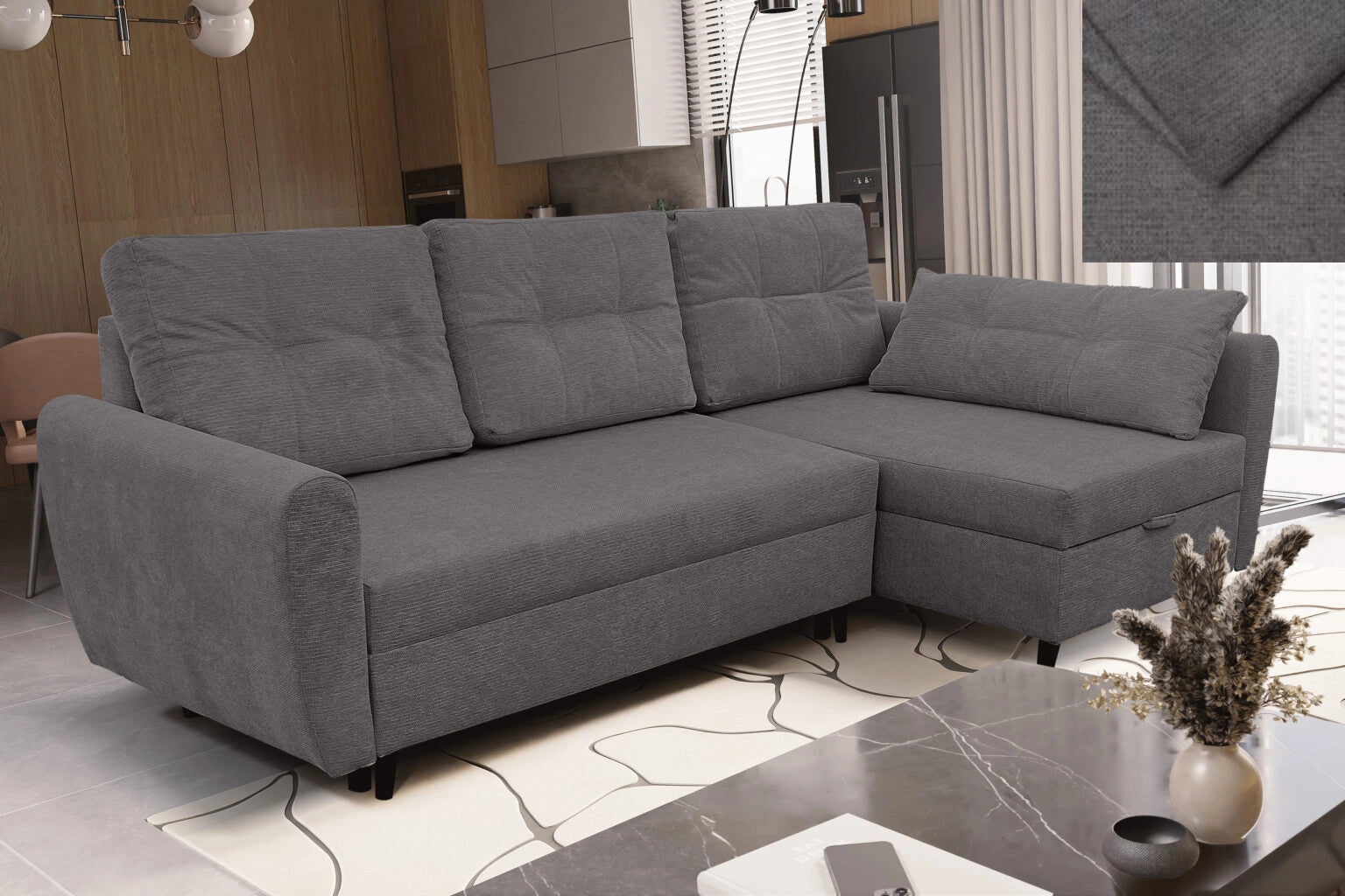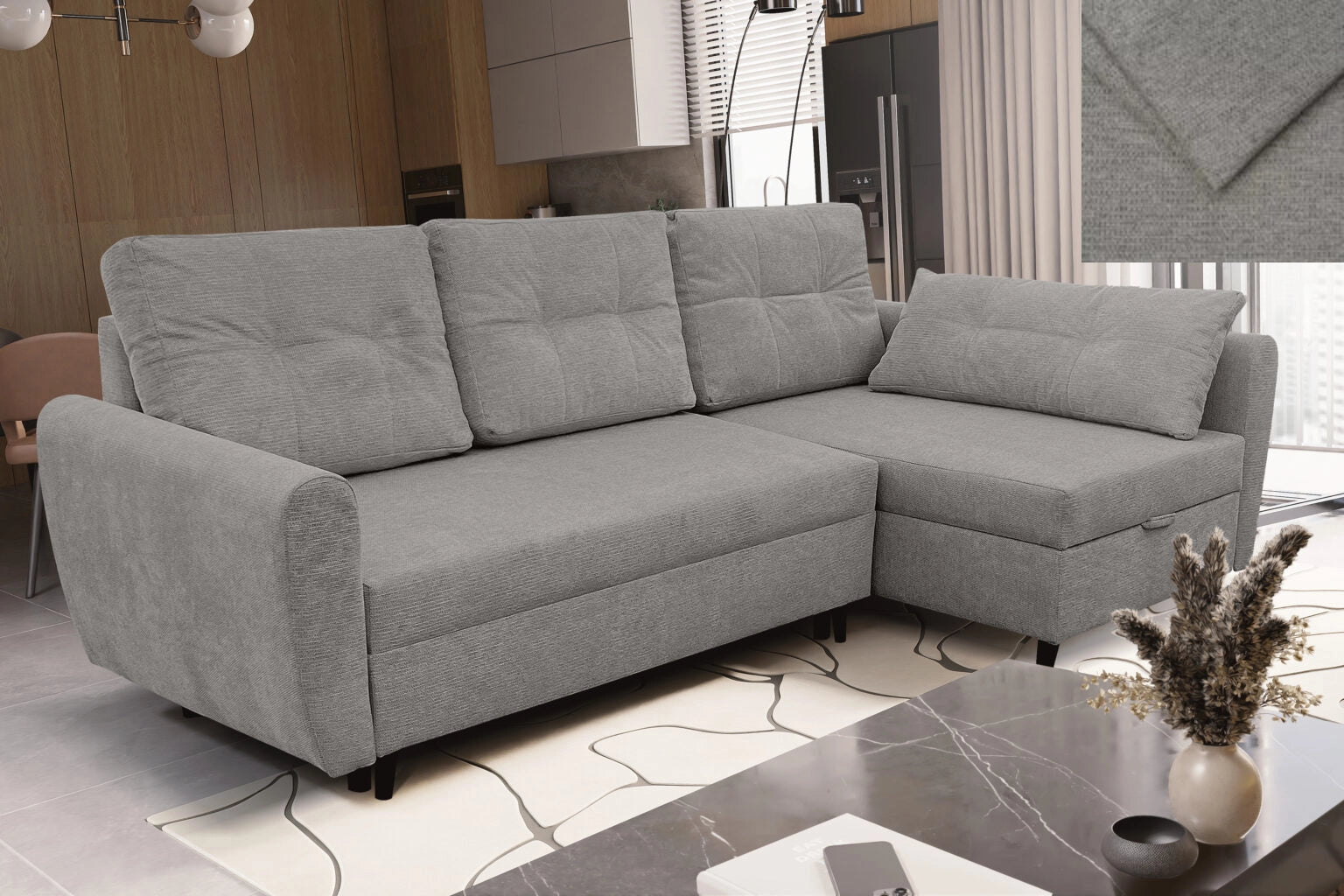 Ausgestattet mit einer Schlaffunktion lässt sich das Ecksofa leicht in ein geräumiges Bett verwandeln, und der Bettkasten ermöglicht eine praktische Aufbewahrung. Es ist ein Sofa, das sich sowohl für den täglichen Gebrauch als auch für Gästeeinsätze hervorragend eignet.