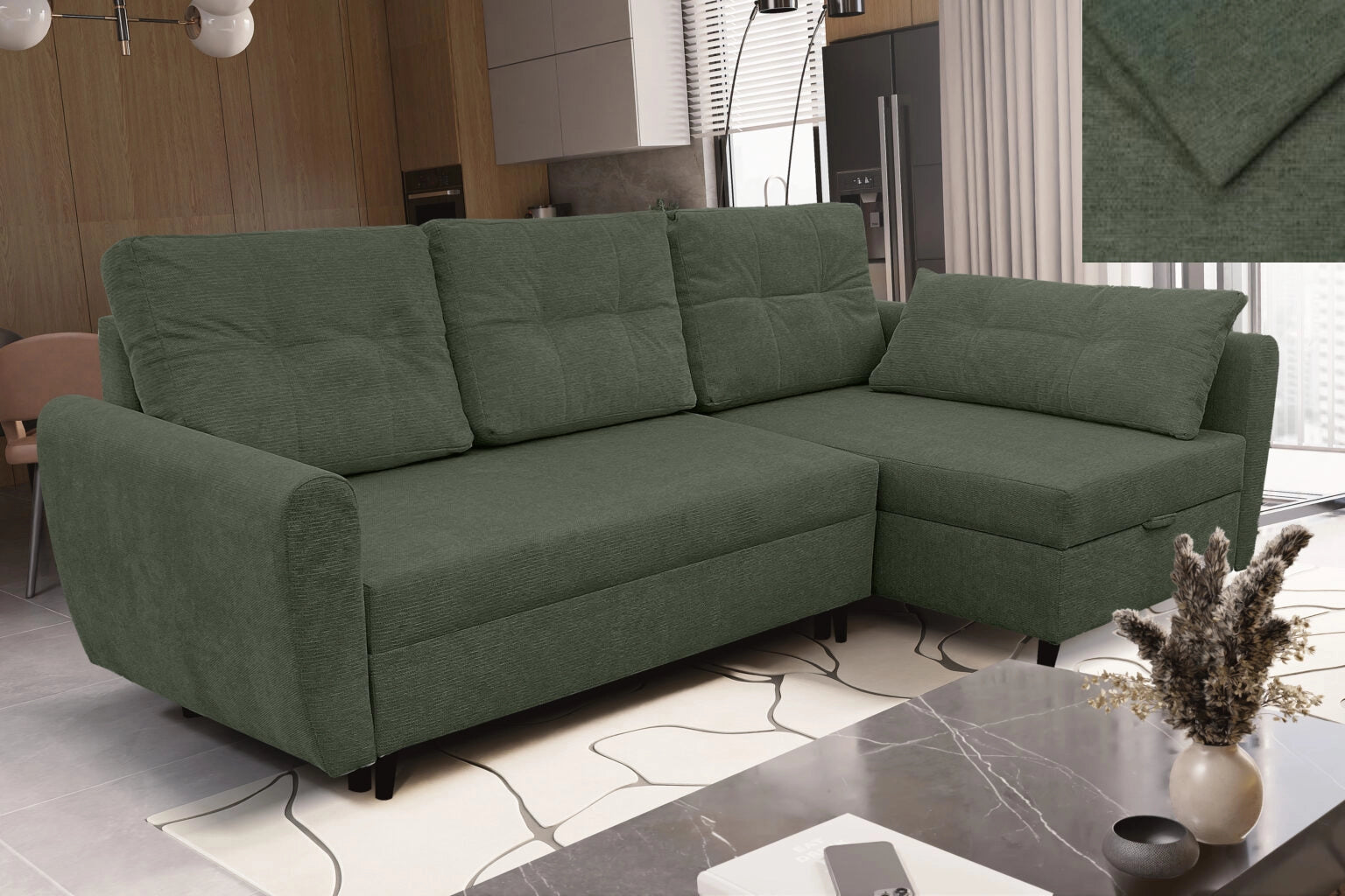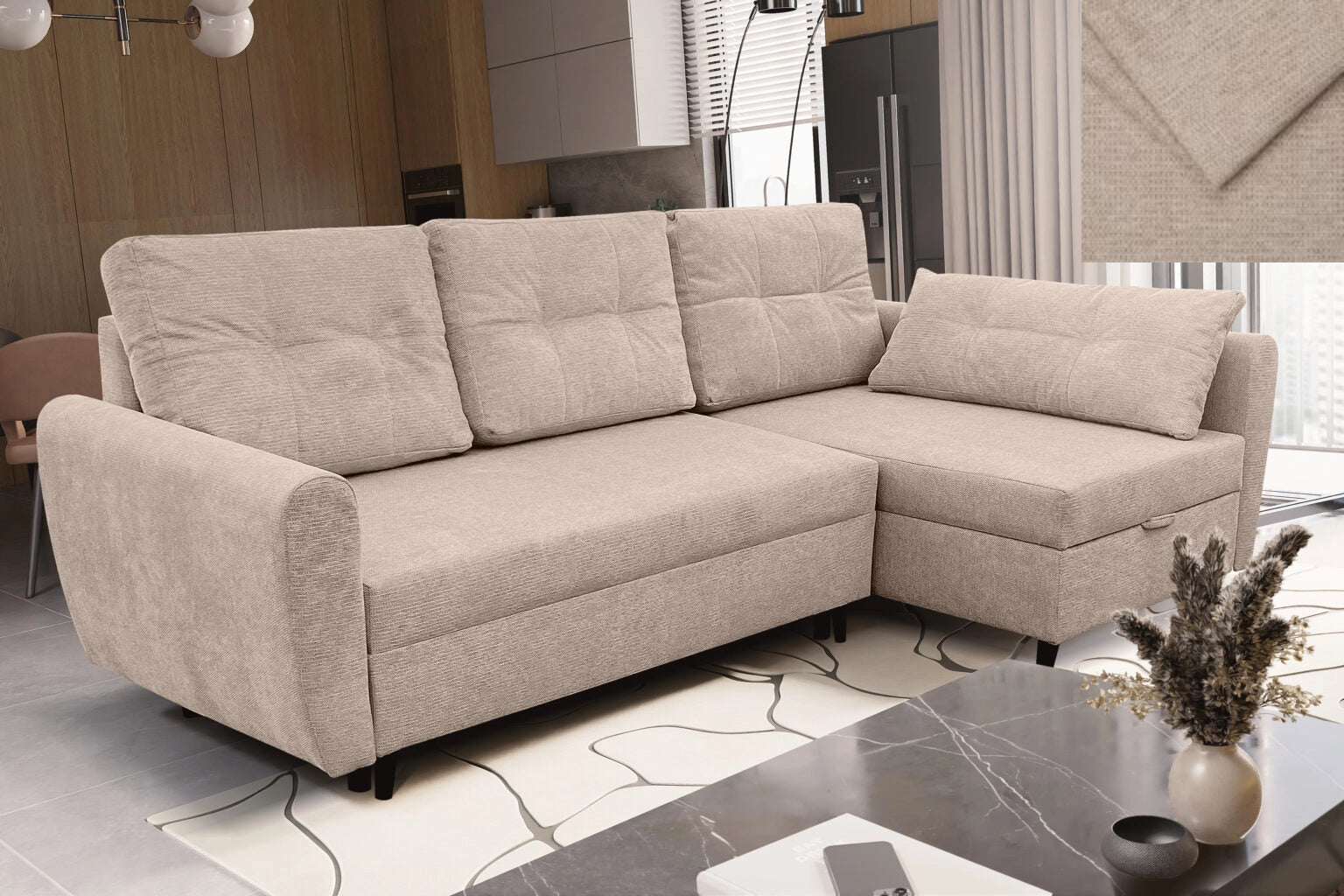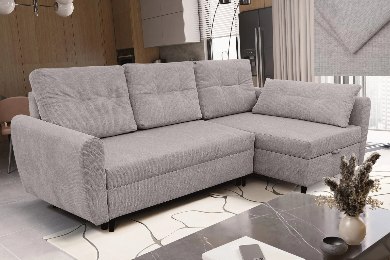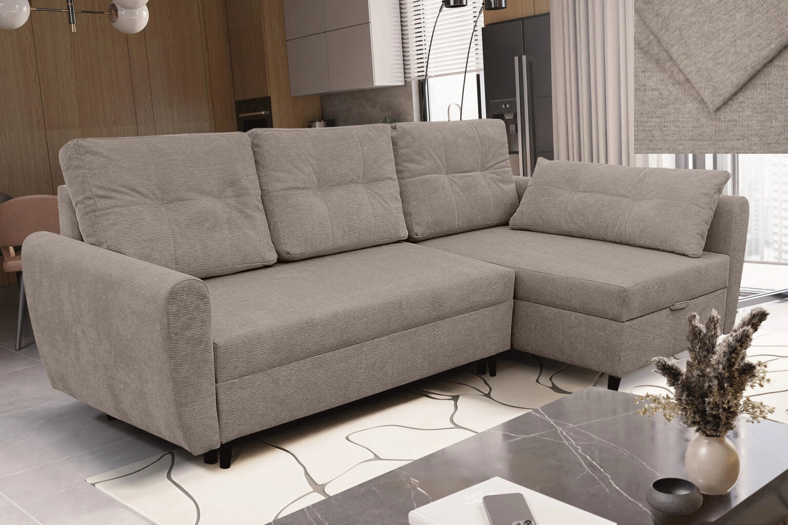 Ausgestattet mit einer Schlaffunktion lässt sich das Ecksofa leicht in ein geräumiges Bett verwandeln, und der Bettkasten ermöglicht eine praktische Aufbewahrung. Es ist ein Sofa, das sich sowohl für den täglichen Gebrauch als auch für Gästeeinsätze hervorragend eignet.